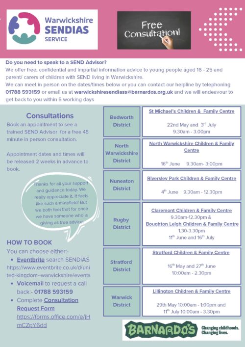 SENDIAS Advisors are offering free training sessions for parents and carers across Warwickshire, both online and in-person. Sessions are designed to educate parents and carers about the support available in schools through SEN Support. We will explore: